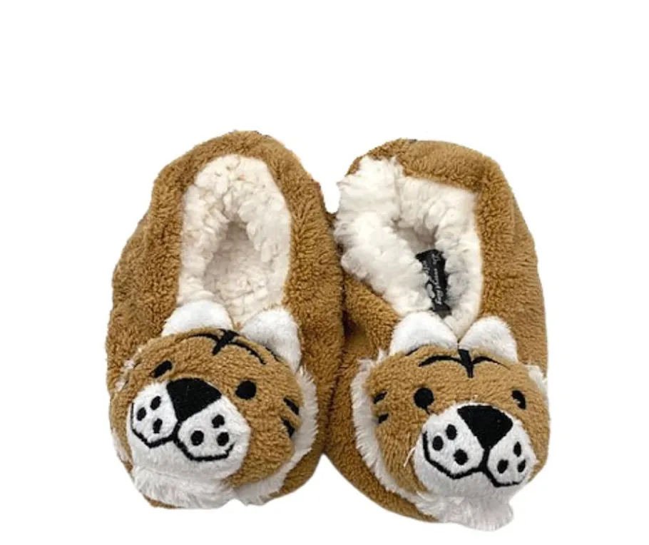 Lasten Antonio eläintossut liukuesteellä. Tiikeri hahmo edessä ja pörröinen teddy sisäpuoli.