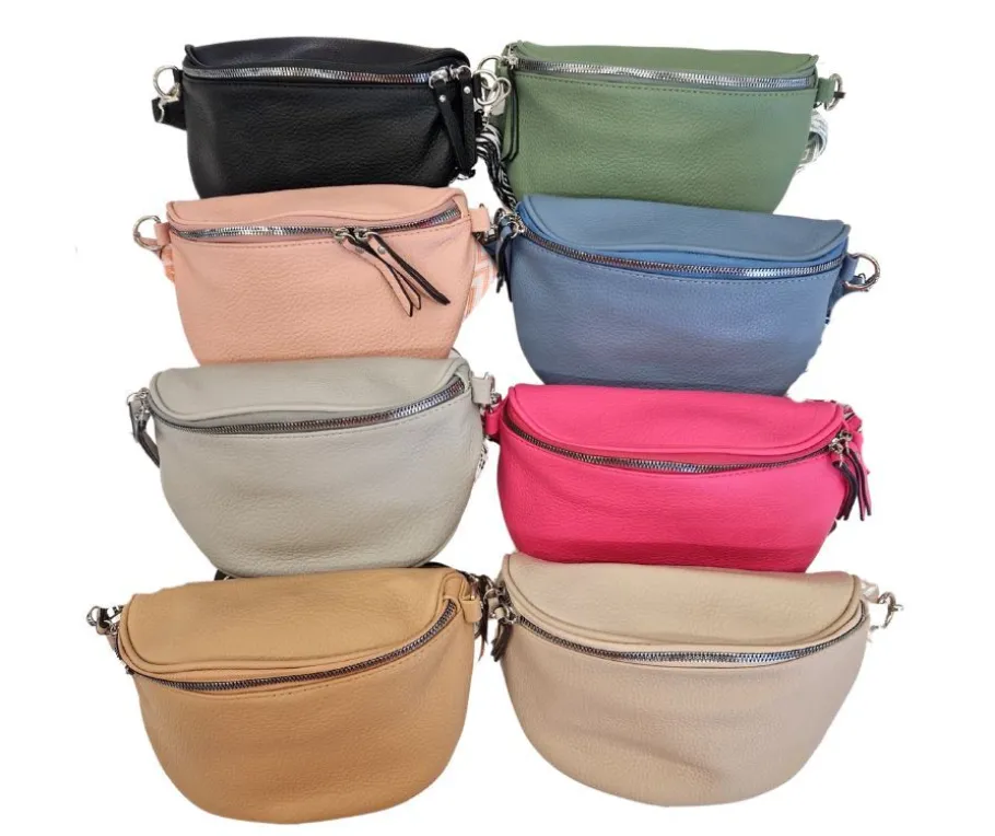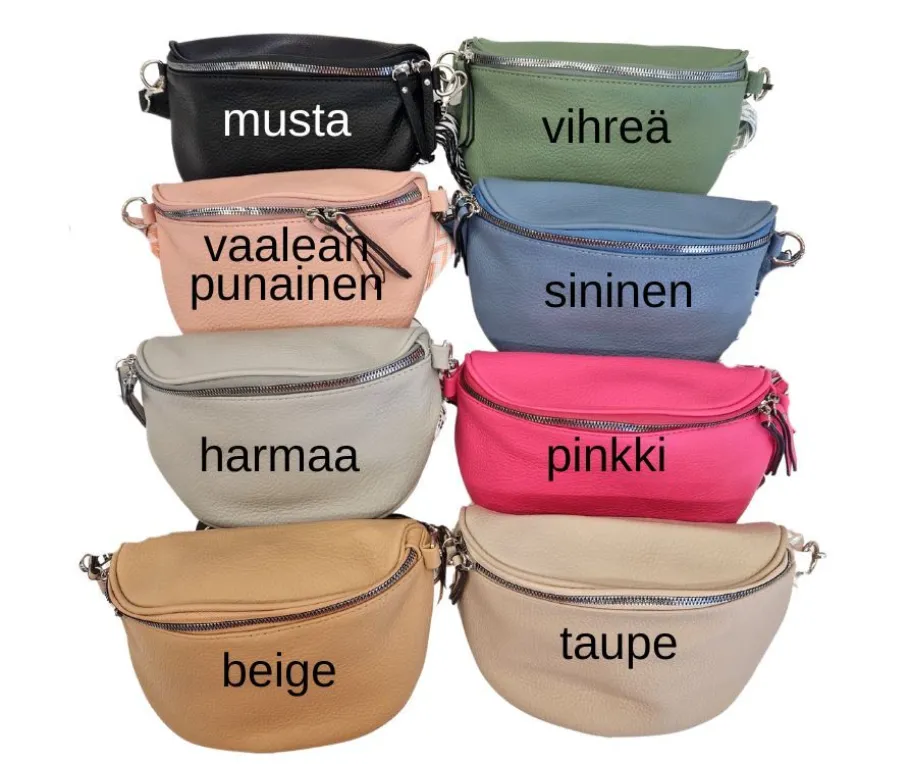 Laukkuun kuuluu irrotettava, säädettävä leveä (n. 4 cm) ja pitkä kuvioitu tekstiilihihna, joten sitä voi kantaa vyölaukkuna tai olkalaukkuna tilanteen mukaan. Värivaihtoehtoina mm. pinkki, taupe, musta ja vihreä – löydä oma suosikkisi!
