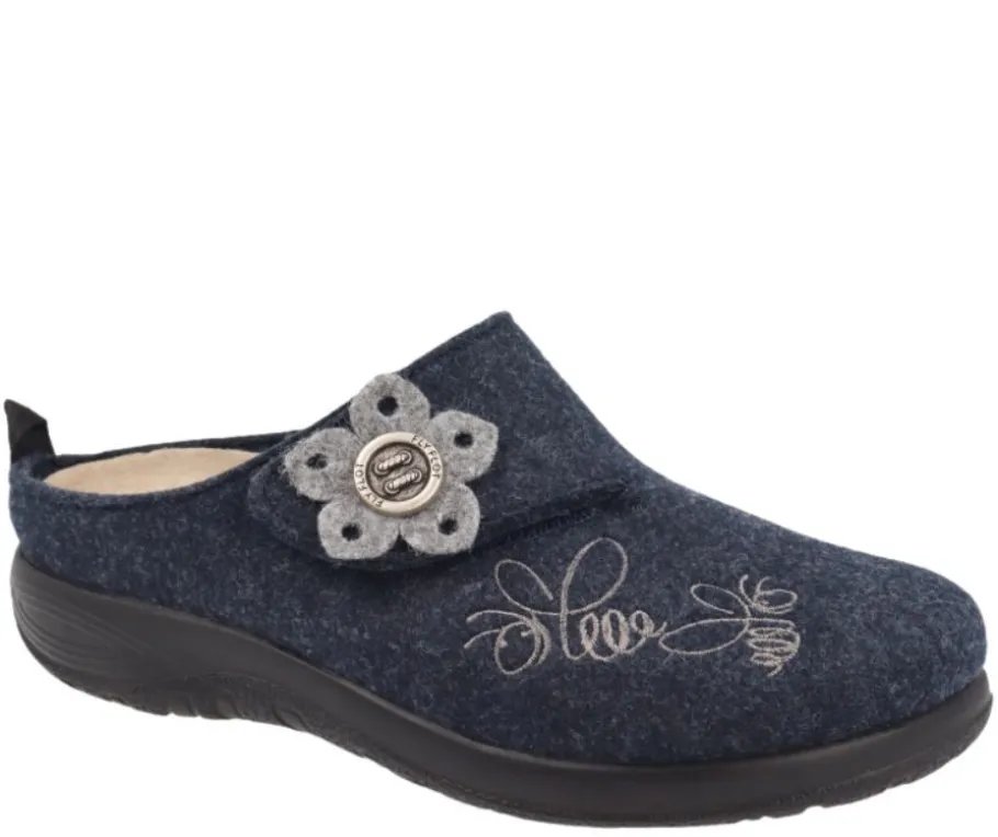 Fly Flot pistokastossujen valmistuksessa on hyödynnetty kierrätettyjä muovipulloja, joten ne ovat ympäristöystävällinen valinta. Tummansinisen sävyyn on lisätty harmaita yksityiskohtia, ja kaunis kukkakoriste.