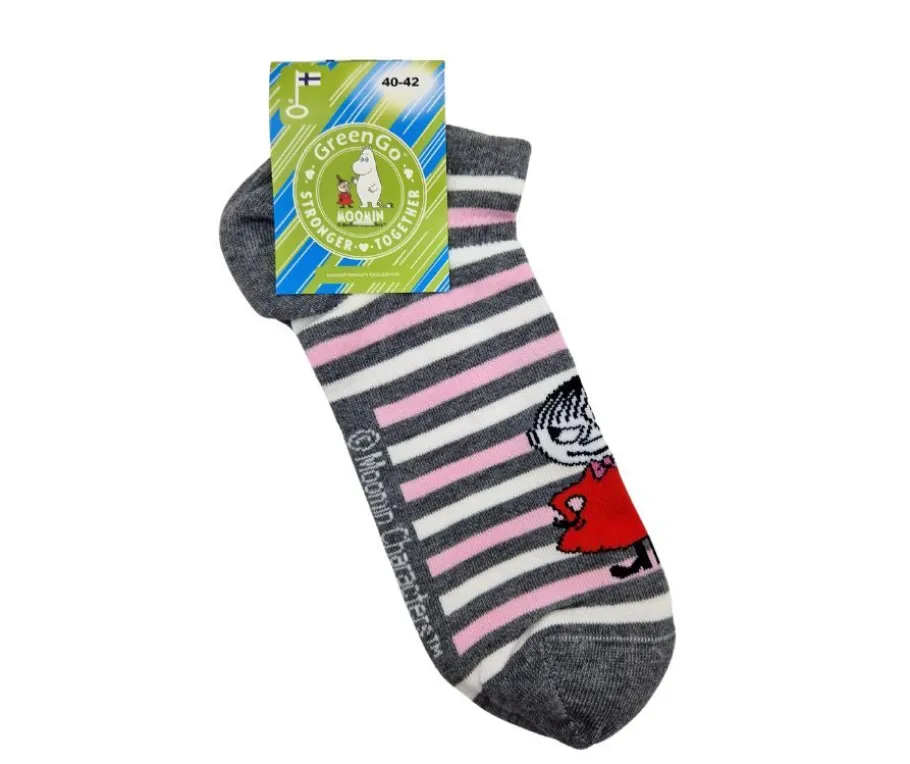 GreenGo muumisukat ovat laadukkaat ja Suomessa Orivedellä valmistetut puuvillasukat, joissa seikkailee rakastettu Pikku Myy. Harmaa-valko-vaaleanpunainen raitakuosi tuo ilmettä pukeutumiseen ja tekee sukista mainion lahjaidean kaikenikäisille.