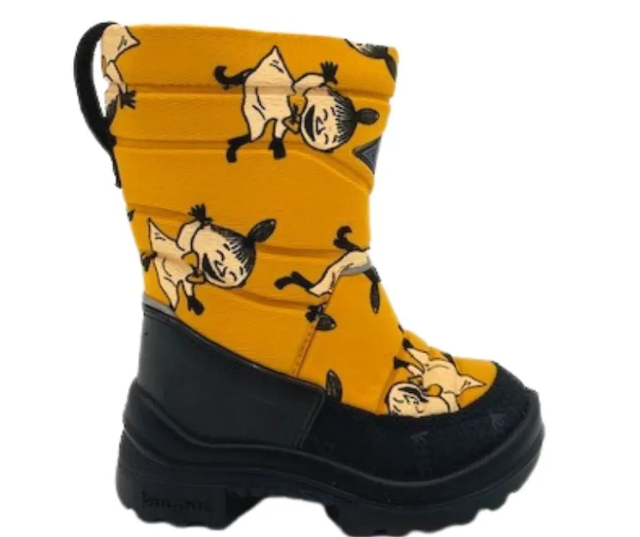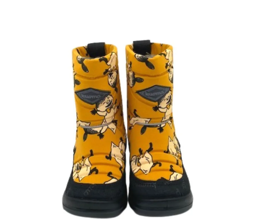Kuoma tuo iloa ja lämpöä talveen näillä Putkivarsi Okra Pikku Myy -talvikengillä, jotka ovat täynnä iloista Muumi-kuosia.