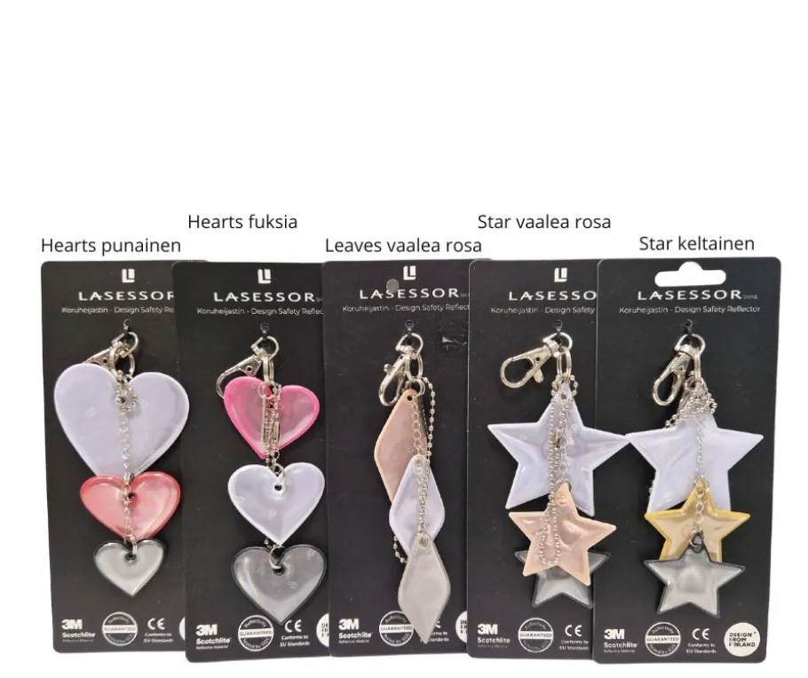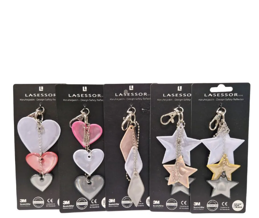 Lasessor koruheijastin yhdistää tyylin ja turvallisuuden. Kolmiosainen koruheijastin on saatavilla salmiakin, sydämen tai tähden muotoisena eri sävyissä, ja se on valmistettu korkealaatuisesta 3M™ Scotchlite™ High Gloss -heijastavasta materiaalista. Heijastin on EU-vaatimusten mukainen ja auttaa näkymään pimeällä.