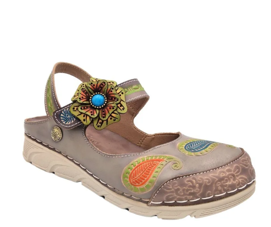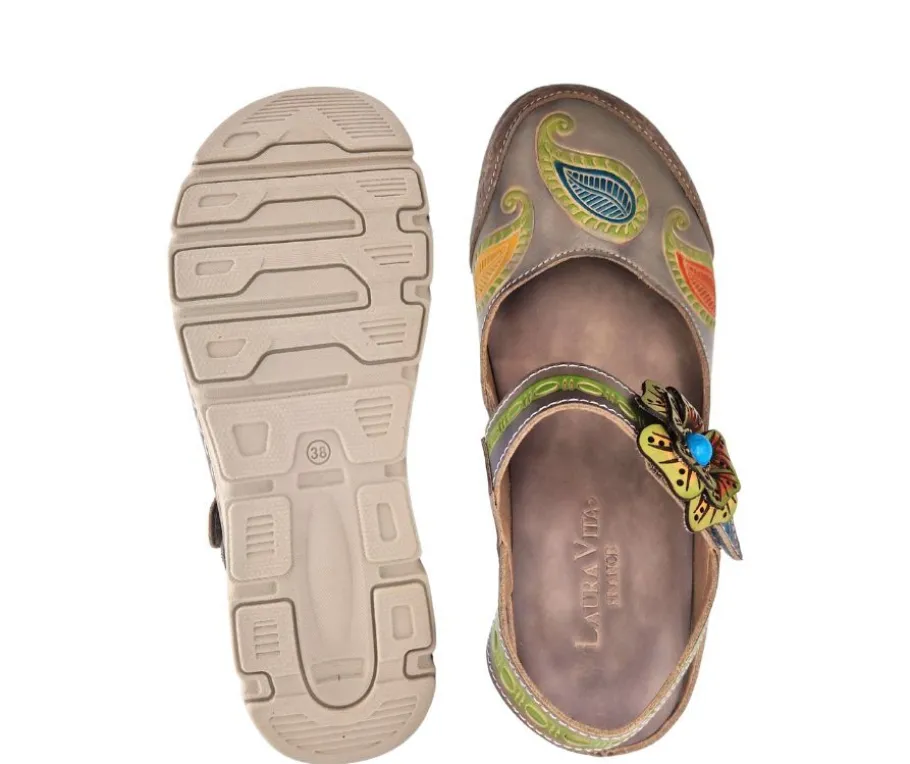 Näissä Laura Vita -kengissä yhdistyvät rohkea design ja käytännöllisyys. Harmaan ja monivärisen pinnan kruunaa näyttävä kukkakoriste, joka tuo kenkiin uniikkia ilmettä. Tarrakiinnitys mahdollistaa täydellisen istuvuuden, ja aito nahkapäällinen takaa hengittävyyden koko päivän ajan.