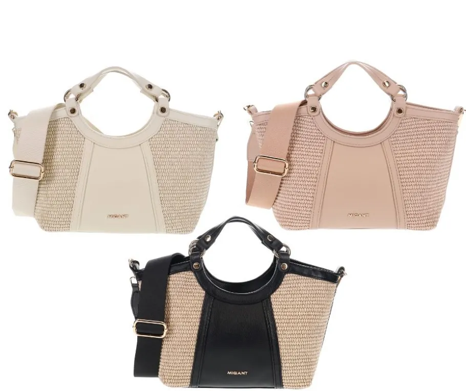 Migant MG-1688 -laukku yhdistää keinonahan ja punotun kuosin elegantilla tavalla. Saatavilla hillityissä sävyissä – off white, nude ja black – tämä laukku on näyttävä mutta helposti yhdisteltävä. Tekstiilivuorattu sisätila sisältää avotaskun ja vetoketjutaskun pikkutavaroille.