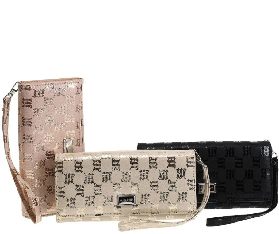 Tämä tyylikäs lompakko on valmistettu keinoaineesta ja saatavilla kauniissa metallinhohtoisissa väreissä: beige, black ja pink. Lompakon etuosassa on Migant-logo laatta, joka antaa lompakolle ylellisen ilmeen. Pinnassa on koristekuosi, joka lisää tyylikkyyttä ja persoonallisuutta. Lompakko tarjoaa runsaasti tilaa korteille ja sisältää kätevän vetoketjutaskun kolikoille tai muille pienille esineille.