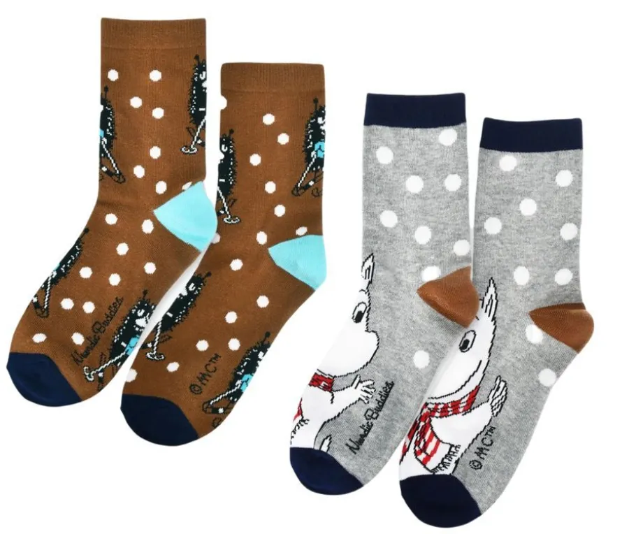 Paketti sisältää kaksi erilaista väriyhdistelmää. Muumipeikko ja Haisuli ilahduttavat ja tuovat hymyn lasten kasvoille. Muumi sukkapaketissa on harmaat ja ruskeat sukat.