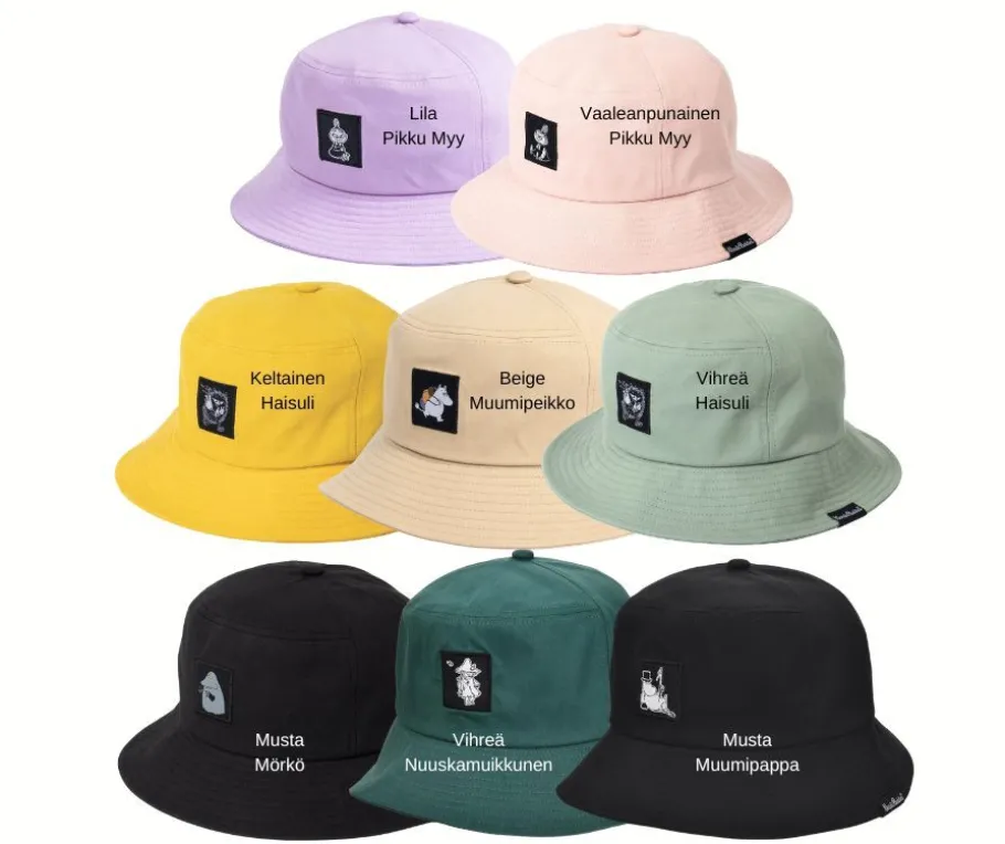 Yksi värinen lierihattu, jossa Muumihahmo kuvana edessä. Valitse oma suosikkisi laajasta värivalikoimasta. Mukava ja huoleton lierihattu arkeen ja vapaa-aikaan.
