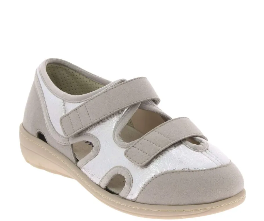 Stretch-materiaalista valmistettu harmaa päällinen mukautuu jalkojen muotoihin ja tarjoaa miellyttävän käyttökokemuksen myös ongelmajaloille, kuten vaivaisenluulle tai vasaravarpaalle. Tyylikäs hopeanhohtoinen kuviointi tuo ilmettä kenkiin.