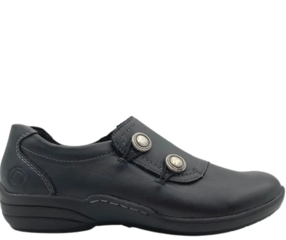 Remonten mustat nahkaiset kävelykengät erottuvat edukseen kahdella hopeanvärisellä koristenapilla ulkosyrjällä, jotka viimeistelevät kengän tyylin. Mustaa nahkaa, joka on kestävä ja tyylikäs valinta moneen tilanteeseen.