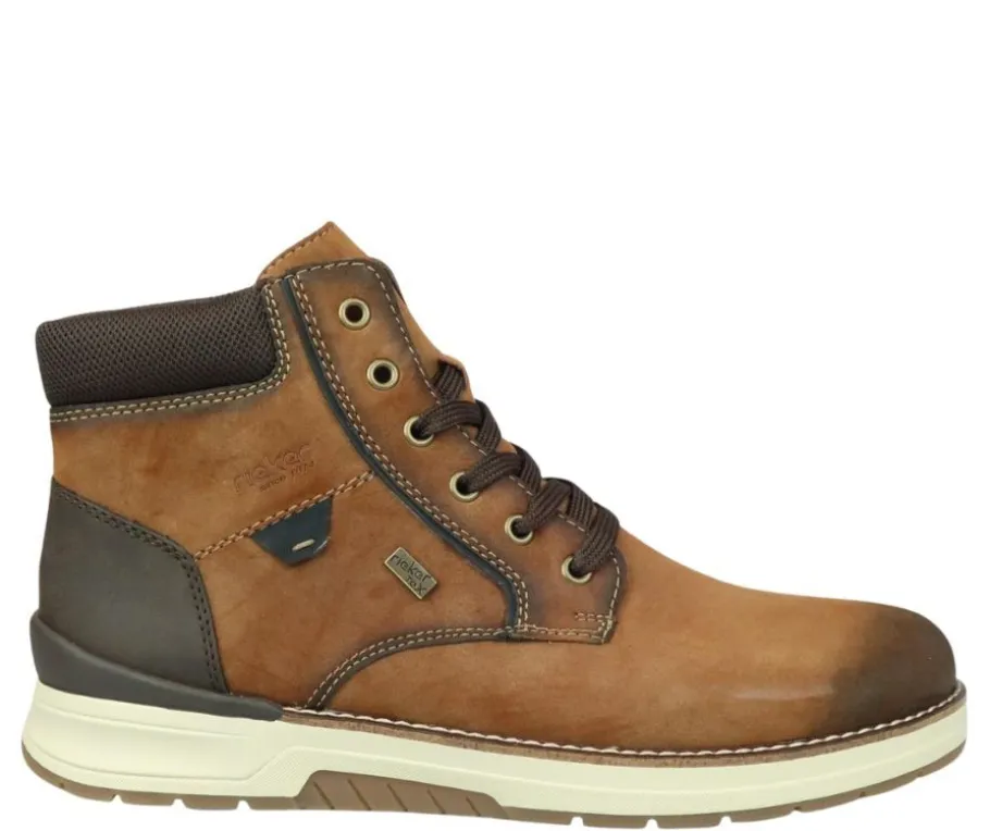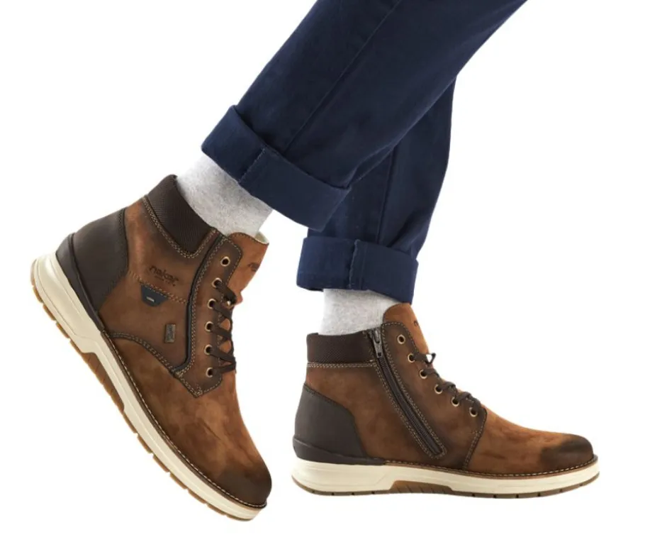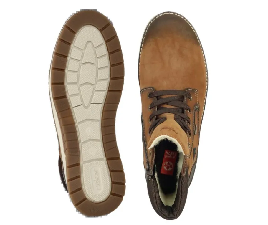 Näissä ruskeissa keinonahkaisissa nilkkureissa on Rieker-Tex-käsittely, joka suojaa kenkää vedeltä ja lialta. Nauhoitus ja sisäsyrjällä oleva vetoketju takaavat istuvuuden ja helpottavat pukemista.