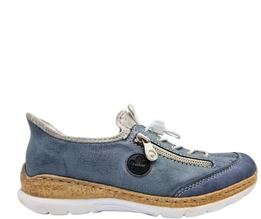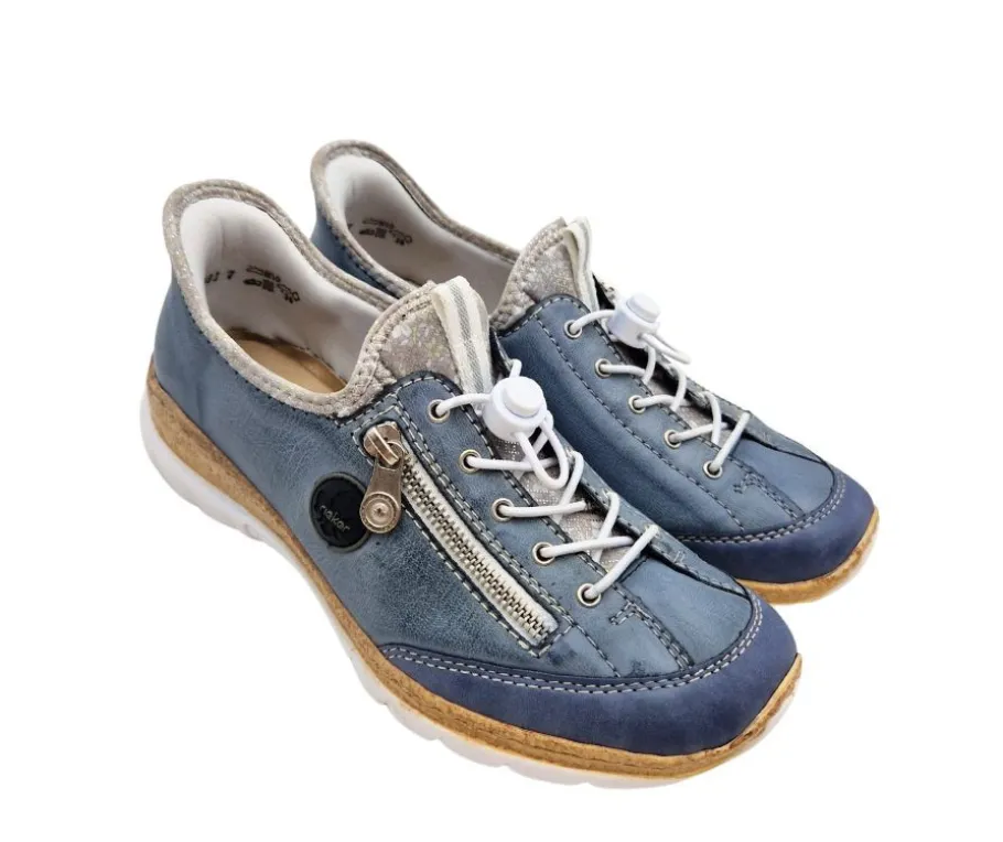 Rieker Ready2GO N42F2-14 -kävelykengät yhdistävät tyylin ja käytännöllisyyden. Sininen keinomateriaali saa lisäsäihkettä hopeakimalteesta, ja koristevetoketju ulkosyrjällä viimeistelee ilmeen. Ready2GO-malliston ansiosta kengät sujahtavat jalkaan helposti ilman kyykistymistä.