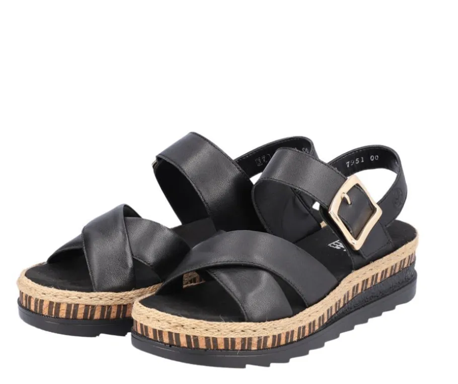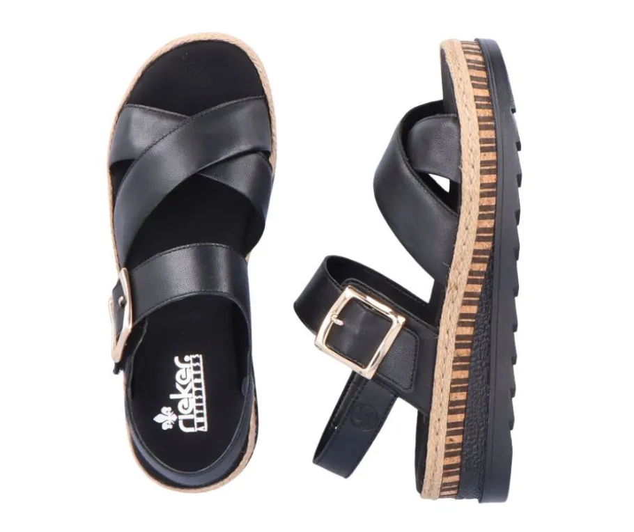Rieker V7951-00 -sandaalit hurmaavat mustalla nahkapäällisellä ja beigensävyisillä yksityiskohdilla. Solkikoriste ja hillitty värimaailma tekevät näistä sandaaleista helposti yhdisteltävän osan kesätyyliä.