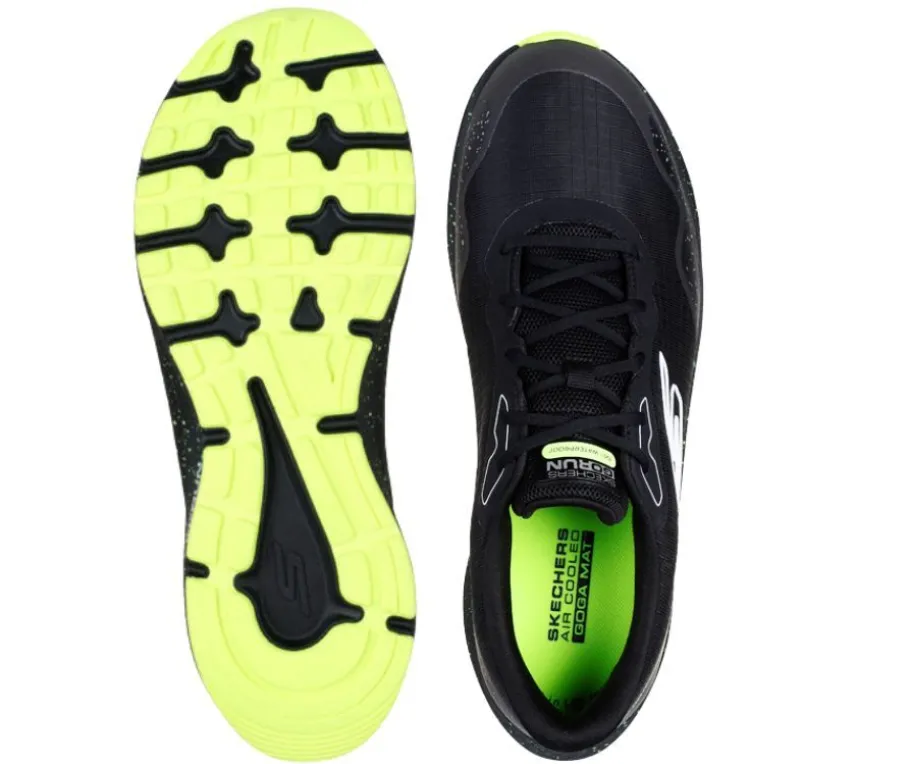 Skechers Air-Cooled Goga Mat -pohjallinen tuo lisätukea ja viileyttä jalalle, jotta mukavuus säilyy pitkienkin lenkkien aikana. Musta väritys neonkeltaisilla tehosteilla tekee kengistä tyylikkäät aktiiviseen elämäntyyliin.