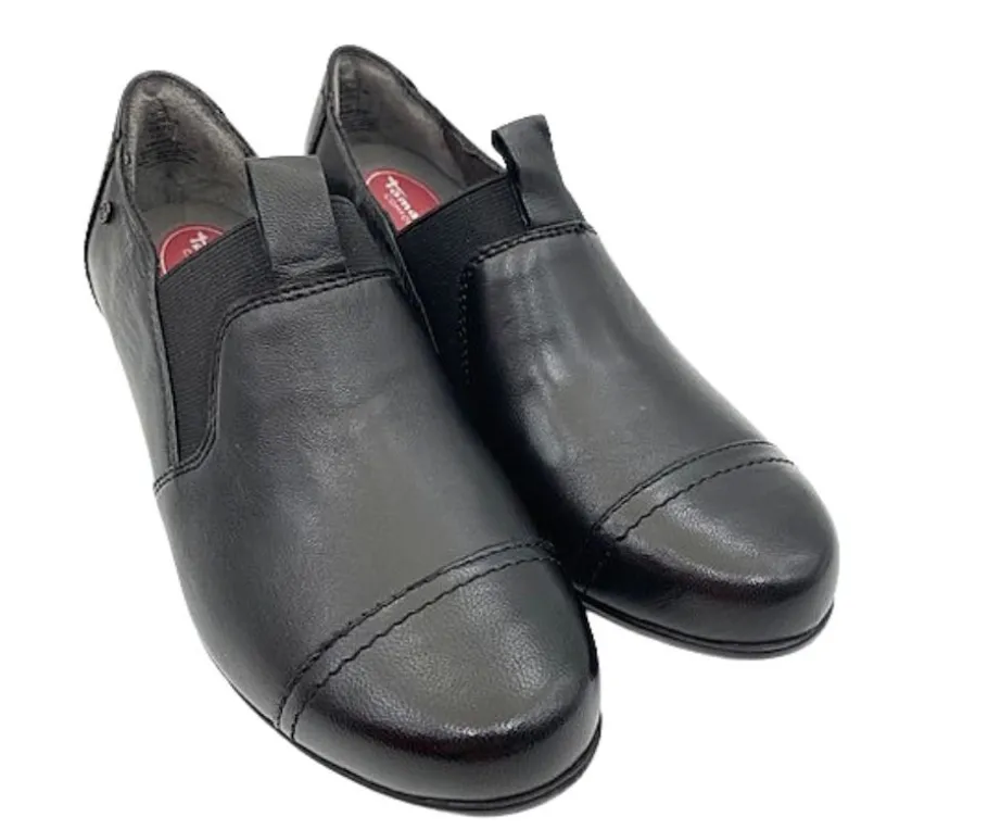 Mustat nahkaiset Tamaris kävelykengät kopisemattomalla korolla. Mustat aitoa nahkaa olevat naisten kävelykengät. Sivuilla joustovenykkeet kengän jalkaan pukemisen helpottamiseksi. Sormilenkki edessä.