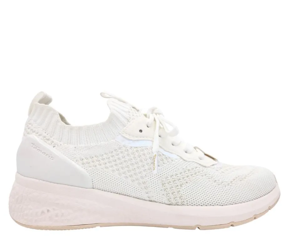 Tamaris 1-23714-42 kävelykengät ovat modernit ja mukavat kengät, joiden hengittävä valkoinen kangaspäällinen saa säihkettä hienovaraisesta kimalluksesta. Sukka-mallinen suuaukko joustavalla resorilla tekee pukemisesta helppoa ja istuvuudesta napakan. Nauhoitus viimeistelee sporttisen ilmeen.