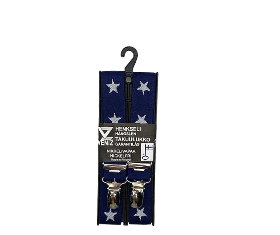 Kotimaiset Suomessa valmistetut lasten henkselit. Mallia löytyy sinisenä valkoisella tähtikuviolla.