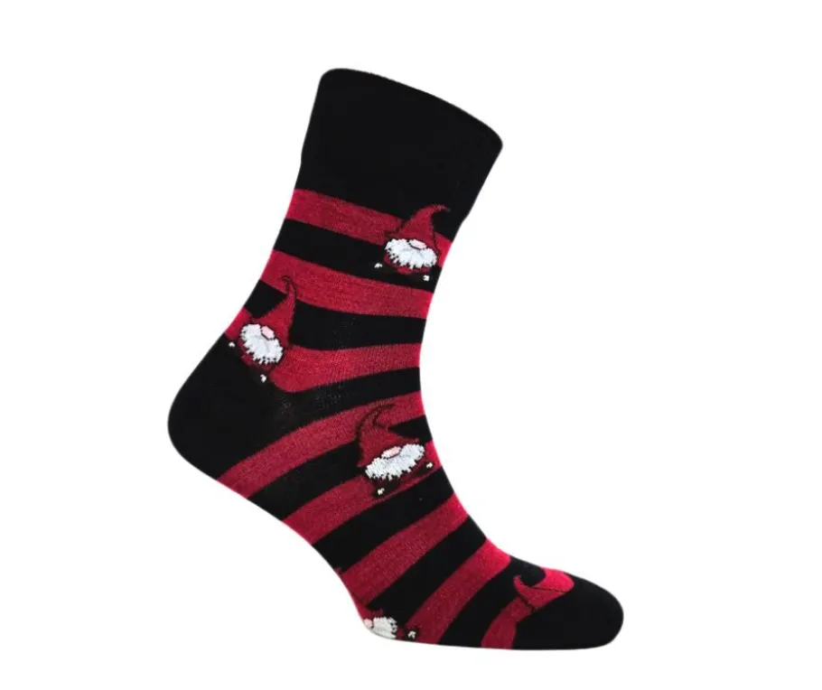 Punamustat raidat ja hauskat tonttukuvioinnit tekevät näistä sukista täydellisen talven tunnelmaa täydentävän asusteen. Sukat ovat saatavilla aikuisille sopivassa koossa ja ne tuntuvat mukavilta jalassa niin kotona kuin ulkoilussa.