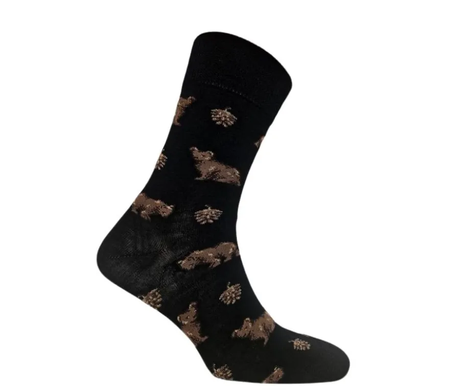 Musta pohjaväri yhdistyy ruskeisiin otso- ja käpykuvioihin, jotka tuovat sukkiin persoonallisen ja luonnonläheisen ilmeen. Aikuisten koossa saatavilla olevat sukat sopivat monenlaiseen tyyliin.
