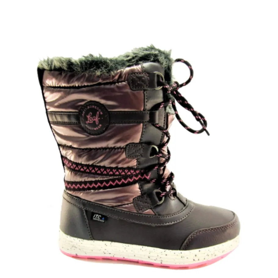 Vuorelliset talvikengät Leafilta, jotka on helppo pukea jalkaan vetoketjun ansiosta. Nauhoituksen avulla saat kengän istumaan jalkaasi täydellisesti. Hieno burgundyn punainen / violetti hieman metallinhohtava väri, jossa pinkki ulkopohja. Lasten lestin kenkä,eli hieman kapeahko malli. Saatavilla koot 30-39.
