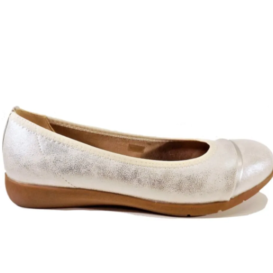 Kauniit hopean sävyiset kesäballerinat arkeen ja juhlaan. Kevyesti kiilamainen kanta antaa juuri sopivasti ryhtiä olemukseen säilyttäen mukavan askelluksen.