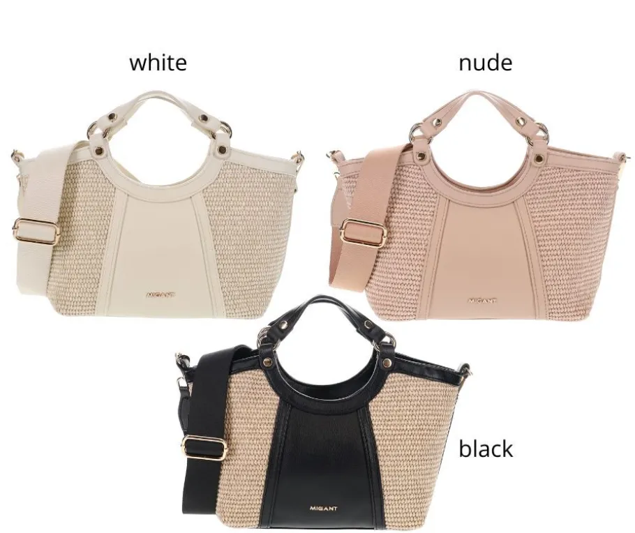 Migant MG-1688 -laukku yhdistää keinonahan ja punotun kuosin elegantilla tavalla. Saatavilla hillityissä sävyissä – off white, nude ja black – tämä laukku on näyttävä mutta helposti yhdisteltävä. Tekstiilivuorattu sisätila sisältää avotaskun ja vetoketjutaskun pikkutavaroille.