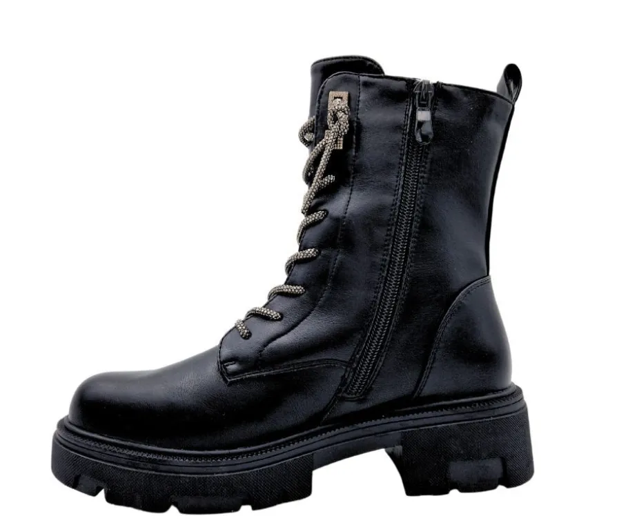 Näissä maihareissa on nauhat, joita koristaa tyylikäs glitter-yksityiskohta, tuoden ripauksen säihkettä kokonaisuuteen. Nauhoituksen avulla kengän saa hyvin istuvaksi jalkaan, ja sisäsyrjällä oleva vetoketju tekee pukemisesta helppoa ja nopeaa. Varren takana oleva sormilenkki lisää käytännöllisyyttä.