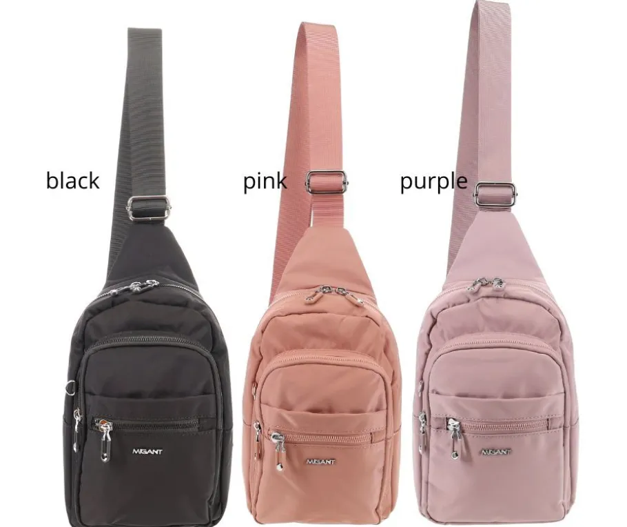 Reppu toimii kätevästi crossbody-mallina, ja sen säädettävä, leveä n. 4 cm tekstiilihihna on irrotettavissa ja siirrettävissä toispuoleiseksi. Modernin ilmeen viimeistelee edessä oleva Migant-logo ja hillityt värivaihtoehdot: black, pink ja purple.