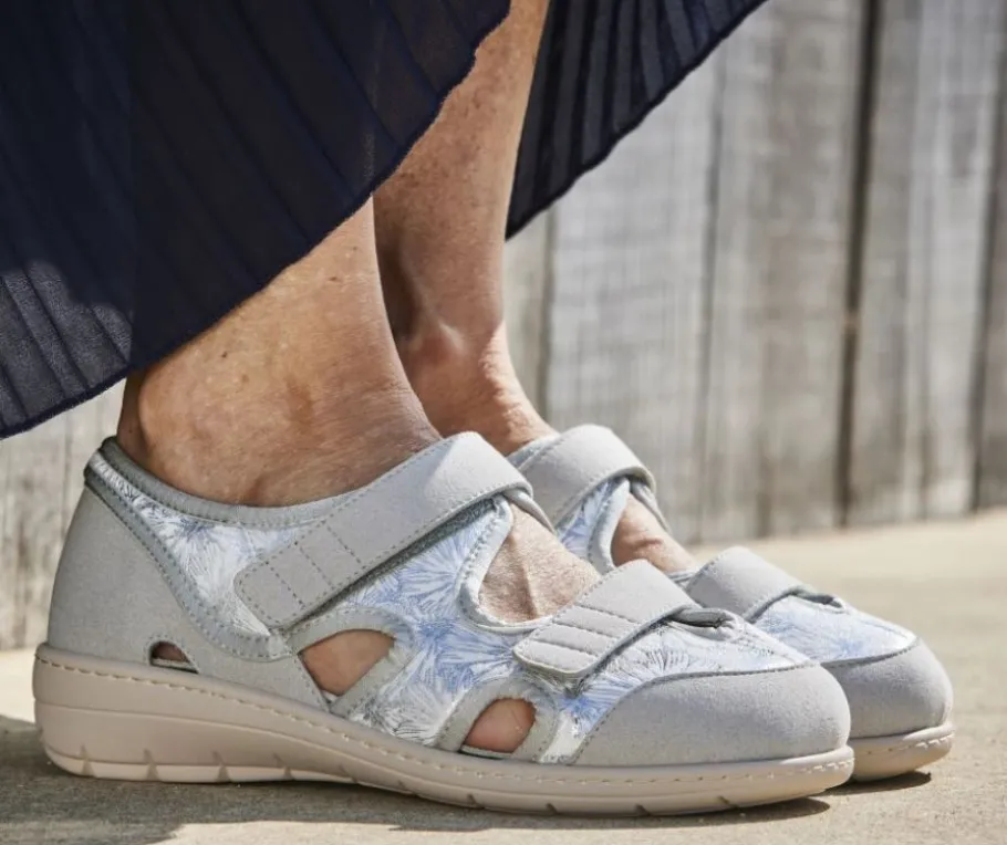 Stretch-materiaalista valmistettu harmaa päällinen mukautuu jalkojen muotoihin ja tarjoaa miellyttävän käyttökokemuksen myös ongelmajaloille, kuten vaivaisenluulle tai vasaravarpaalle. Tyylikäs hopeanhohtoinen kuviointi tuo ilmettä kenkiin.