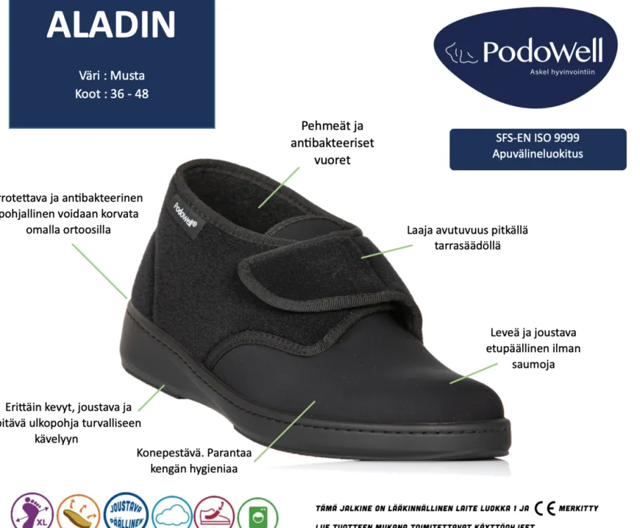 - Tarrakiinnitys, jonka avulla kengät on helppo pukea ja kengän lestiä voi säätää