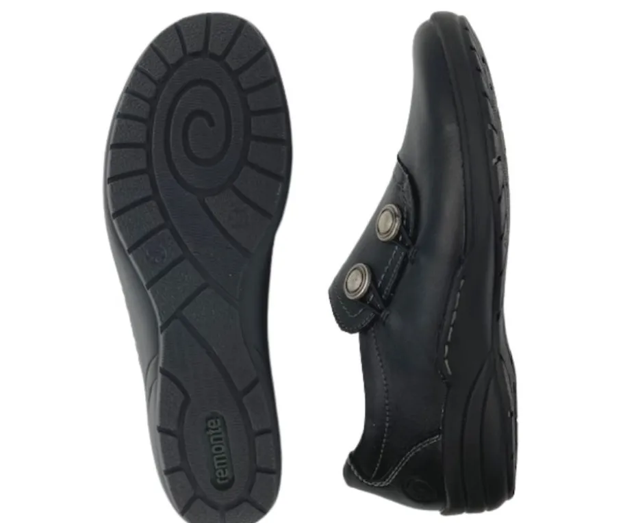 Remonten mustat nahkaiset kävelykengät erottuvat edukseen kahdella hopeanvärisellä koristenapilla ulkosyrjällä, jotka viimeistelevät kengän tyylin. Mustaa nahkaa, joka on kestävä ja tyylikäs valinta moneen tilanteeseen.