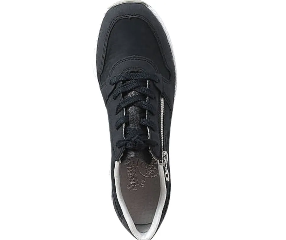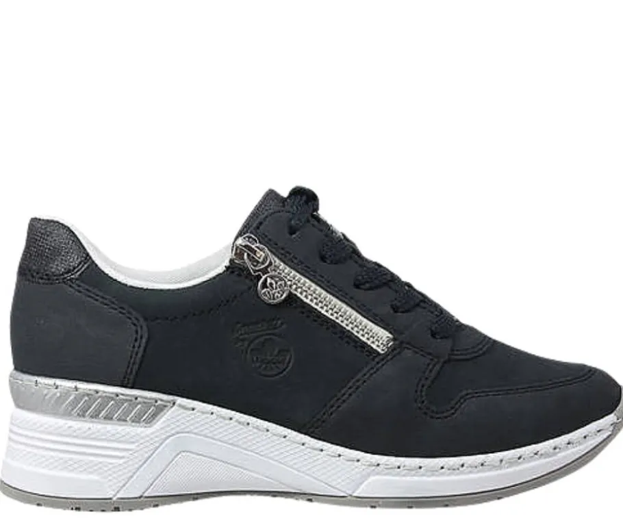 Tummansiniset Rieker kävelykengät tukevalla kiilapohjalla! Rieker Antistress-pohja vaimentaa iskuja ja on kevyt rakenteinen tuoden kenkiin käyttömukavuutta. Vetoketju nopeuttaa kengän jalkaan laittamista.