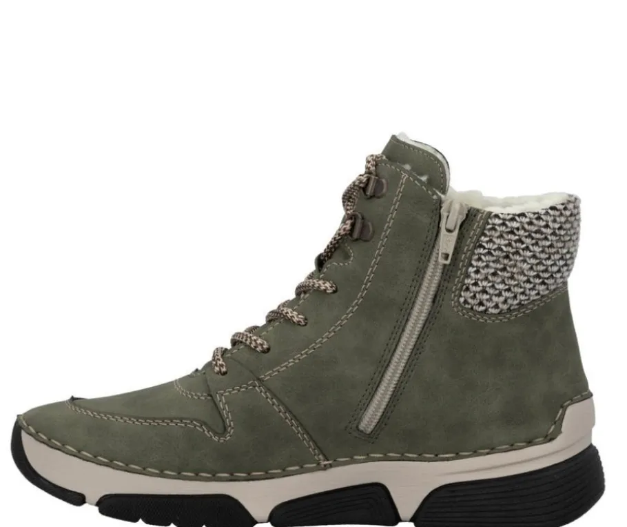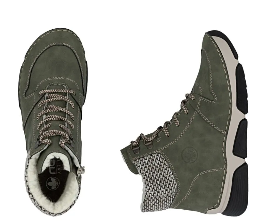 Rieker 45955-54 -nilkkurit hurmaavat vihreällä sävyllään ja pörröisellä teddyvuorilla, joka tuo sekä lämpöä että pehmeyttä kylmiin päiviin. Nilkkureiden ilme rakentuu pinnan hienovaraisista leikkauksista ja varren tekstiiliosasta, joka luo kengälle persoonallisen ilmeen. Nauhat ja vetoketju tekevät pukemisesta helppoa ja mahdollistavat istuvuuden säätämisen.