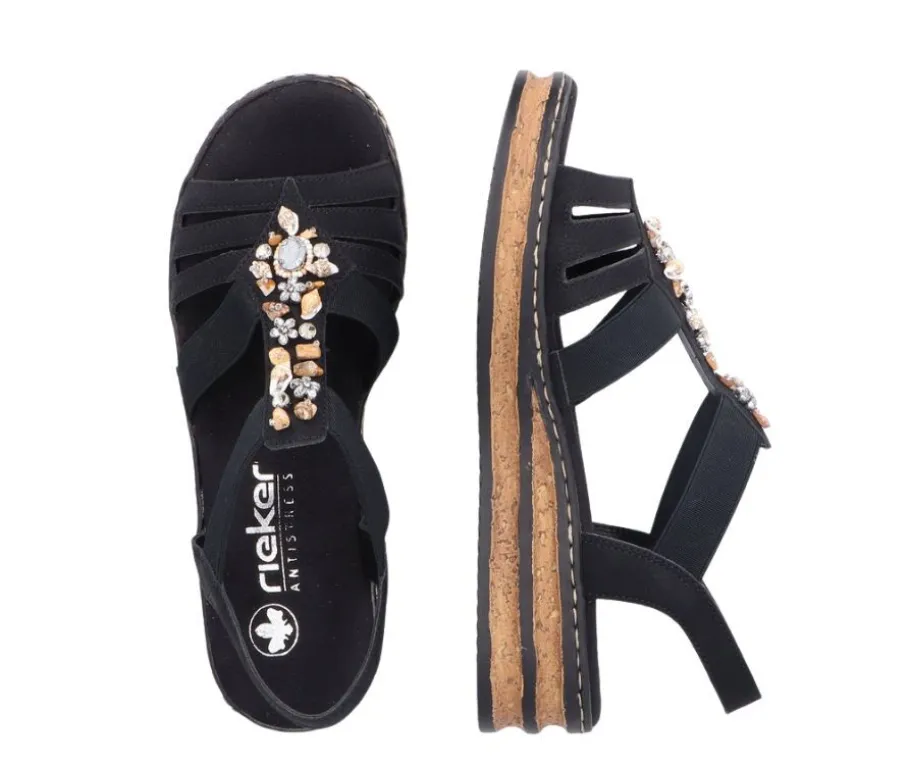 Rieker 62949-00 -sandaalit ovat kevyet ja käytännölliset, mustalla päällisellä ja ruskealla ulkopohjalla. Kauniit koristeet sekä Rieker Antistress -pohja takaavat sekä tyylikkään että mukavan käyttökokemuksen.