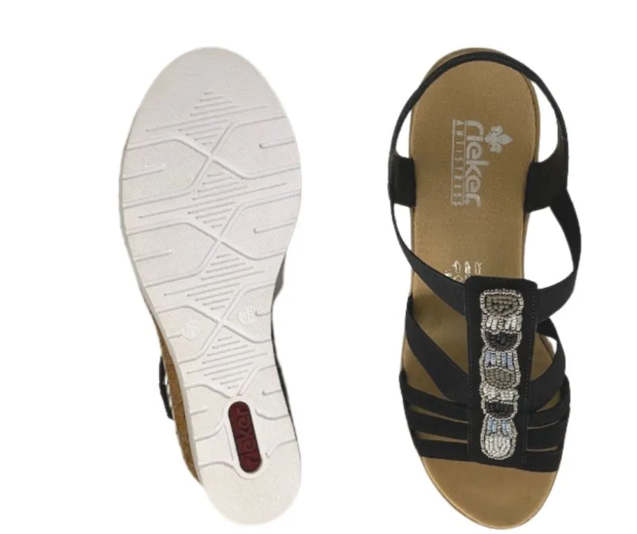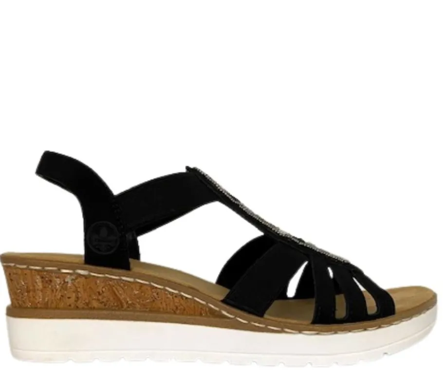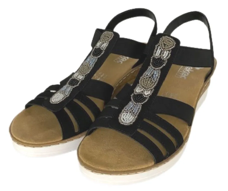 Kesäiset mustat Rieker-sandaalit joustovenykkeillä ja kiilakorolla.