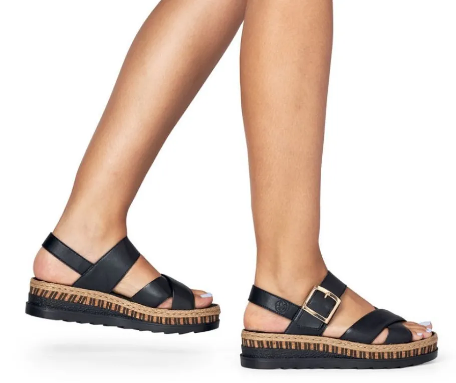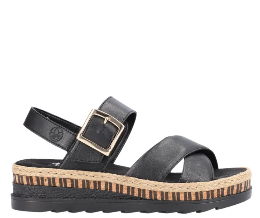 Rieker V7951-00 -sandaalit hurmaavat mustalla nahkapäällisellä ja beigensävyisillä yksityiskohdilla. Solkikoriste ja hillitty värimaailma tekevät näistä sandaaleista helposti yhdisteltävän osan kesätyyliä.