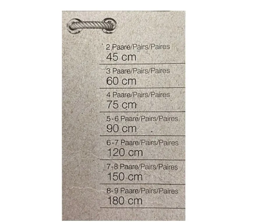 - Kuvissa ohjetaulukko oikean pituisen kengännauhan valintaan