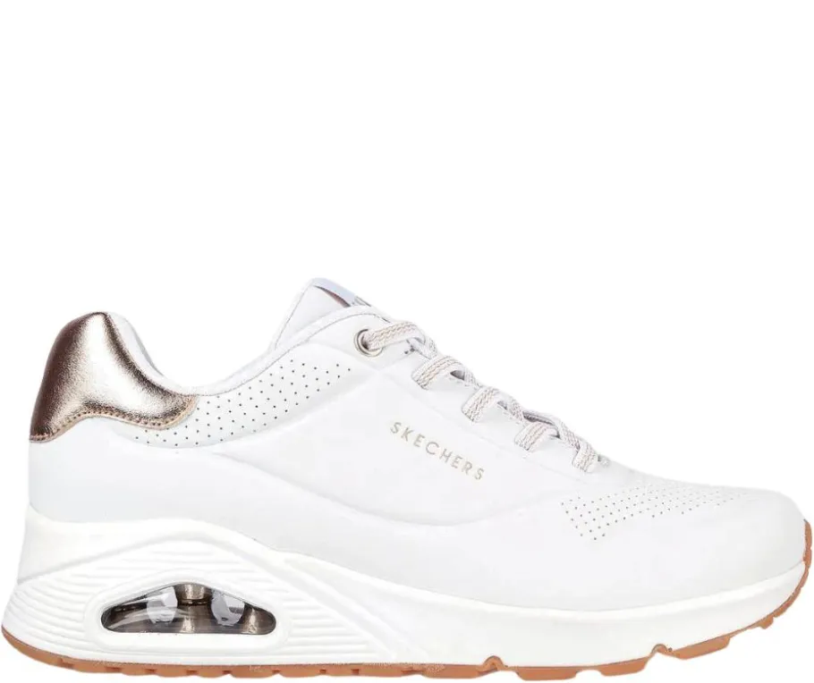 Skechers Uno – Shimmer Away 155196WHT valkoisena ruusukultaisin tehosteineen on väripilkku arkeen.