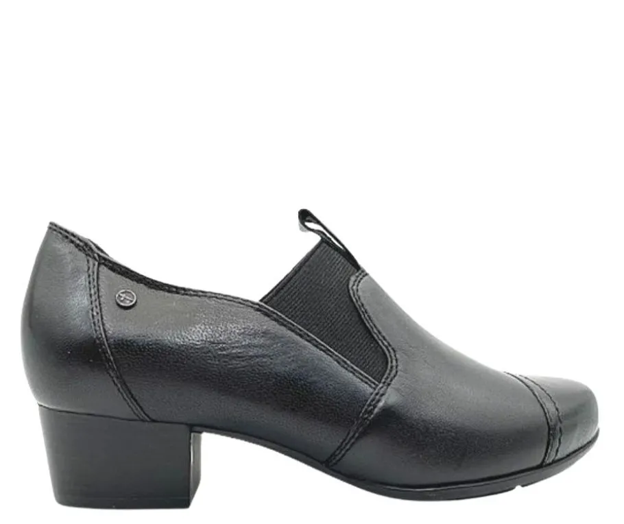 Mustat nahkaiset Tamaris kävelykengät kopisemattomalla korolla. Sivuilla joustovenykkeet ja sormilenkki edessä, kengän jalkaan pukemisen helpottamiseksi.