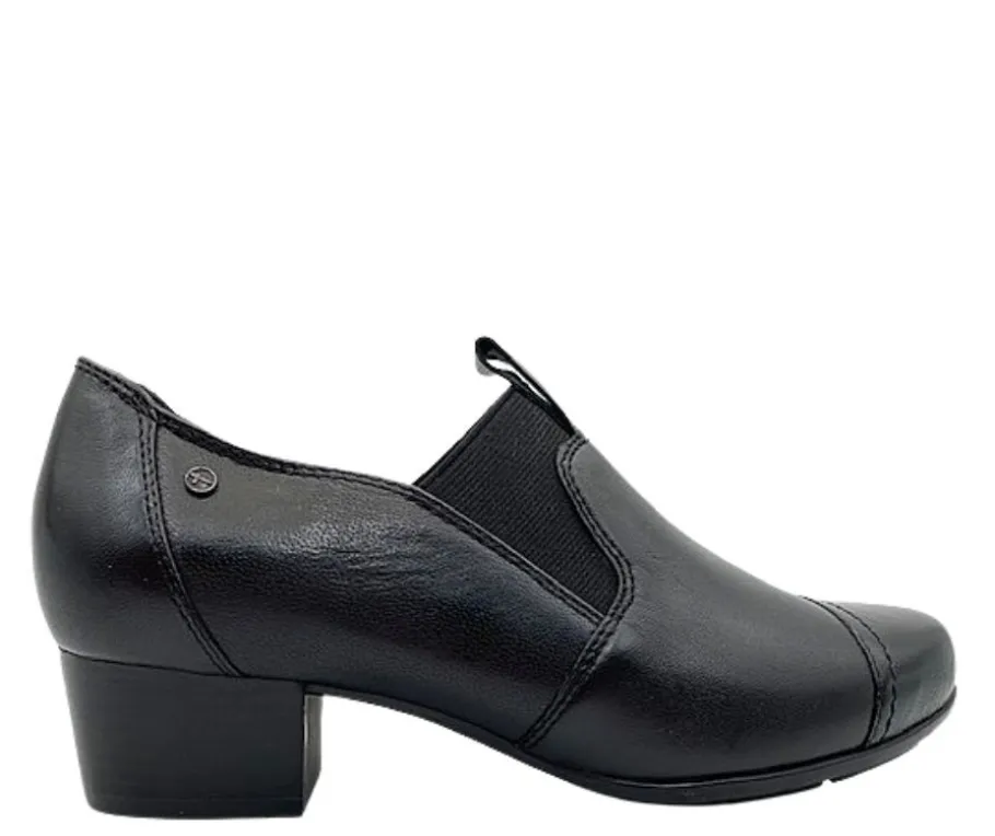 Mustat nahkaiset Tamaris kävelykengät kopisemattomalla korolla. Mustat aitoa nahkaa olevat naisten kävelykengät. Sivuilla joustovenykkeet kengän jalkaan pukemisen helpottamiseksi. Sormilenkki edessä.