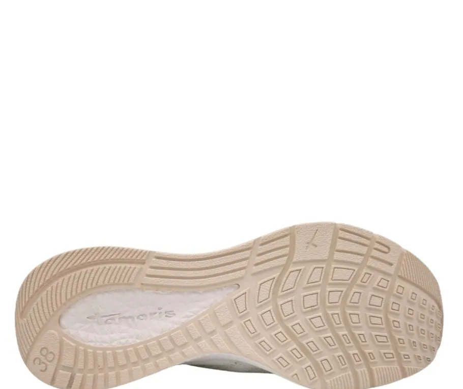 Tamaris 1-23714-42 kävelykengät ovat modernit ja mukavat kengät, joiden hengittävä valkoinen kangaspäällinen saa säihkettä hienovaraisesta kimalluksesta. Sukka-mallinen suuaukko joustavalla resorilla tekee pukemisesta helppoa ja istuvuudesta napakan. Nauhoitus viimeistelee sporttisen ilmeen.